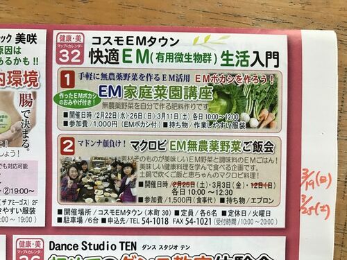 2月20日~3月21日までのふれあい教室は弊店では「EM家庭菜園講座」と「マクロビEM無農薬野菜ご飯会」の二つです。マクロビご飯会は私の急用と講師の恵ちゃんの急用で日にちを3/3、3/19、3/25に変更です。3/3は予定通りですがあとの二日間は変更しまし…